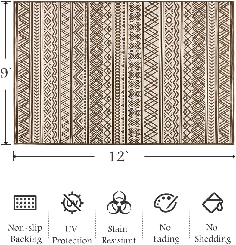 The Boho Outdoor Area Rug in a timeless brown hue adds a touch of warmth and elegance to your outdoor decor, effortlessly complementing any design scheme. Its versatile 9×12 ft size offers ample coverage for large outdoor areas, making it perfect for gatherings, parties, or simply relaxing outdoors.